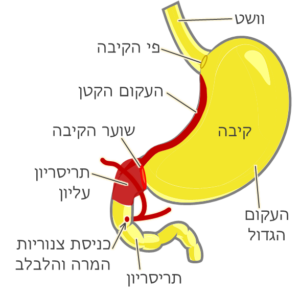 בציור הקיבה שכאן, הצהוב מתייחס לשכבת הנבט אנדודרם והאדום לאקטודרם.