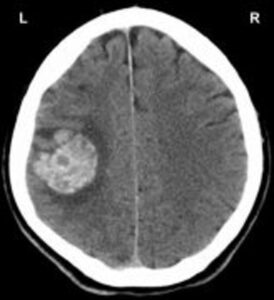בסריקת CT (טומוגרפיה ממוחשבת) של מוח ניתן לראות את השפעה הזו כמערכת של טבעות קונצנטריות (בעלות מרכז משותף) עם גבולות ברורים או כחצי עיגול, בהתאם למיקומו (תמונה עליונה).