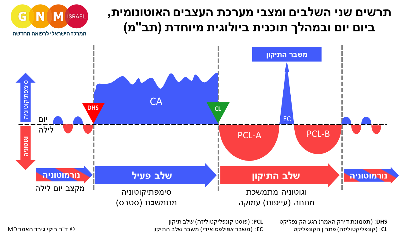 באופן רגיל אנו חיים באיזון בין סטרס יחסי במהלך היום לבין רגיעה ושיקום בלילה, או כפי שד"ר האמר קרא לכך, נורמוטוניה (ראו חץ 'נורמוטוניה'בשמאל התמונה) שהיא למעשה מקצב היום והלילה הרגיל.
