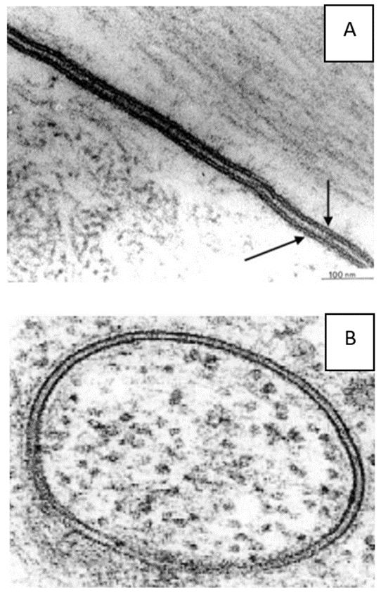 המעטפות של התא, גרעין התא והמיטוכונדריה מופיעים כולם במיקרוסקופ אלקטרונים כשני קווים עם רווח ביניהם, מבנה דמוי כריך זה קיבל את השם "קרום התא". (מקור 6) ראו מיקרוגרפים אלקטרונים [צילומי מיקרוסקופ האלקטרונים] A ו-B.