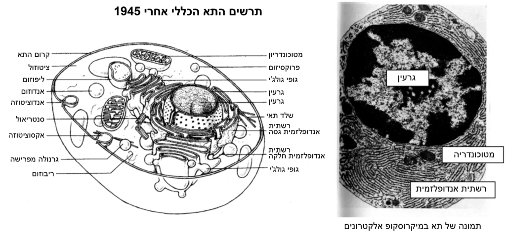 - קרומי התא, הגרעין והמיטוכונדריה מופיעים כעת כולם כשני קווים עם רווחים ביניהם, מראה זה נקרא "קרום התא" (unit membrane’) והוא עומד בניגוד לקו היחיד שהיה מקובל לפני 1940;